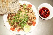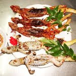 Dông nướng chấm muối ớt chanh, kèm với lá xoài dông vừa cay lại vừa chua, có hương vị đặc trưng. Xương dông rất mềm, nhai trong miệng lụp bụp, nhâm nhi với ly rượu thuốc thật thú vị.